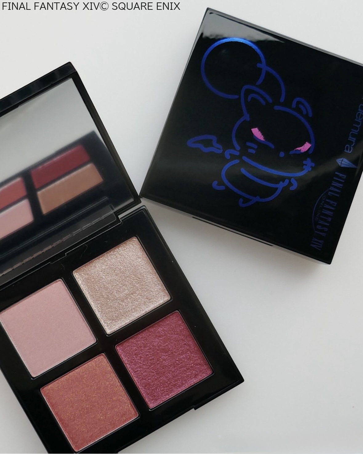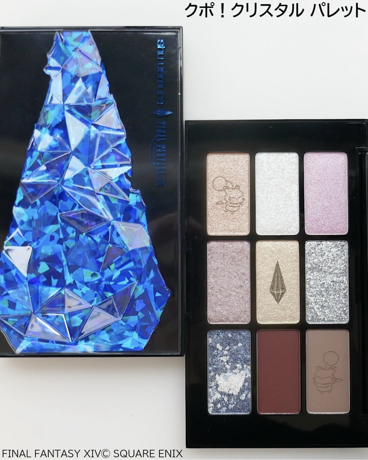 亮點在於盤面上立體的藍色水晶質感,靈感來自遊戲中出現的巨大水晶母體。打開這盤神秘閃耀的眼影盤,映入眼簾的是一系列酷炫夢幻的色調。從宛如雪花的冰白色,到炫目的全像藍色亮片,再到與肌膚柔和融合的霧面柔和灰褐色,應有盡有。部分色調也印有《FF 14》角色莫古力和水晶母體的圖案,更添一抹特別的色彩。